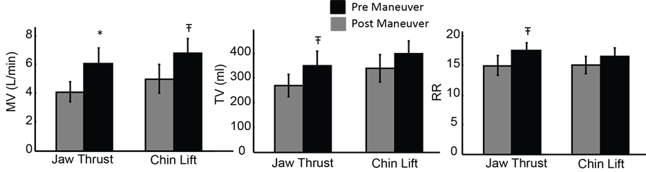 Figure 3. Summary of the Effectiveness of Airway Maneuvers: Minute ventilation (MV), tidal volume (TV) and respiratory rate (RR) pre (gray) and post (black) jaw thrusts and chin lifts in patients undergoing upper endoscopy. Jaw thrusts significantly improved MV from 4.1 to 6.1 L/min (*p < 0.01, paired t-test)—an increase of 25% ± 6%. Jaw thrusts also significantly increased TV from 270 to 350 ml (Ŧp < 0.05, paired t-test), an increase of 16 ± 5%, and increased RR from 15 ± 2 to 18 ± 1 (Ŧp < 0.05, paired t-test)—an increase of 20% ± 8%.Similar to jaw thrusts, chin lifts also significantly improved MV from 5.0 to 6.8 L/min (Ŧp < 0.05, paired t-test), an increase of 21% ± 9%, but did not have a significant effect on either TV or RR.