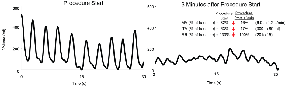 This study has several limitations. There was no standardized protocol for the type of anesthetic medications given, or method of delivery. The sample size was small and it was an observational study. One benefit was that since the anesthesia care teams were blinded to the RVM data and the MV, TV and RR measurements were not used to modify or direct patient care, an unbiased view of the patient’s respiratory status using traditional monitoring techniques was obtained. Additional studies including the comparison of RVM to capnography are ongoing to further assess the utility of RVM during MAC in non-operating room environments. For this study, the RVM was calibrated to a handheld spirometer prior to the procedure to optimize the accuracy of the measurements with less than an average error of 10% for MV and TV, as previously demonstrated [10] . In clinical practice, it is anticipated that to simplify implementation, a baseline will be obtained in the position of the procedure and the RVM system will be used to observe the respiratory trace and track percent change from pre-anesthetic baseline, as is demonstrated in Figure 4 and Figure 5.