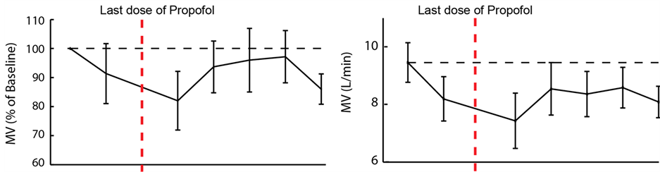 All patients had a significant reduction in ventilatory volumes after propofol administration. Five minutes after the last dose of propofol, MV and TV were reduced while RR was not, suggesting that monitoring respiratory rate alone is not only insufficient in quantifying the extent of respiratory depression, and can be misleading. Across the cohort, RR increased slightly after the last dose of propofol, likely in an attempt to compensate to the greatly reduced TV.