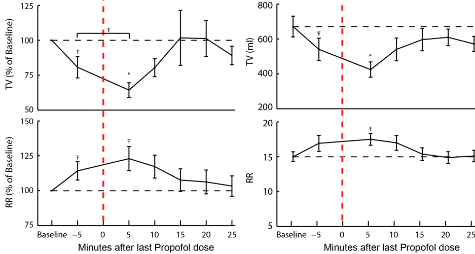 Figure 5. Respiratory Parameter Trends: (a) Minute ventilation (MV), tidal volume (TV) and respiratory rate (RR) relative to baseline (black dashed line) as measured with a Respiratory Volume Monitor (RVM) before and after the last dose of propofol (red dashed line). Five minutes before the last dose of propofol, MV was 91% ± 10% of baseline, TV was significantly reduced to 81% ± 8% of baseline (Ŧp < 0.05), and RR was significantly increased to 114% ± 7% of baseline (Ŧp < 0.05). Five minutes after the last dose of propofol, MV was 82 ± 10% of baseline, while TV was reduced further to 64% ± 5% of baseline (*p < 0.001) and RR was significantly increased to 123% ± 9% of baseline (Ŧp < 0.05). TV was also significantly lower 5 minutes after propofol relative to 5 minutes before propofol (Ŧp < 0.05); (b) Absolute values of MV, TV, and RR relative to the last dose of propofol (red dashed line). At baseline (black dashed line) MV = 9.5 ± 0.7 L/min, TV = 670 ± 60 ml, and RR = 15 ± 0.7. Five minutes before the last dose of propofol, TV was significantly reduced from baseline to 540 ± 60 ml (Ŧp < 0.05). Five minutes after the last dose of propofol, MV was 7.5 ± 1.0 L/min, TV was significantly reduced from baseline to 420 ± 40 ml (*p < 0.001) and RR was significantly increased from baseline to 17 ± 0.8 (Ŧp < 0.05).
