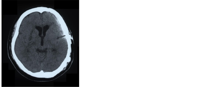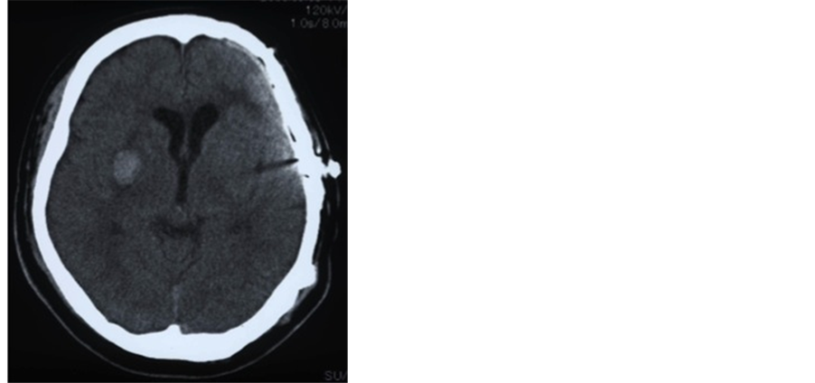 Decompressive craniectomy is a common practice for patients with intracranial hypertension [1] . Craniectomy usually leads to impairment of cerebral blood flow and glucose metabolism, and may also cause changes to the cerebrospinal fluid circulation [2] [3] . Rigid structural reconstruction following craniectomy can release the effects of atmospheric pressure on the brain, and the brain can become dilated [4] -[6] . Therefore, secondary cranioplasty is performed to restore the cerebrospinal fluid, and improve neurological status [7] -[9] . Nevertheless, cranioplasty on a patient with a concave scalp flap at the craniectomy site increases the risks of fluid collection and hematoma [10] . Here, we report an unusual case with presentation of an intracerebral hemorrhage after cranioplasty for a skull defect.
