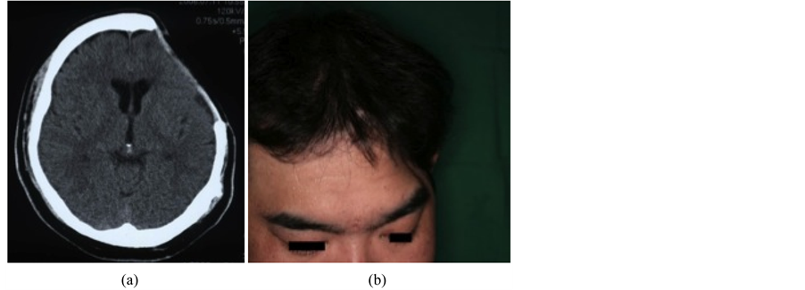 Figure 2. (a) CT scan image and (b) external appearance at the time of admission for cranioplasty. A depressed area was located on the temporal part of the skull.
