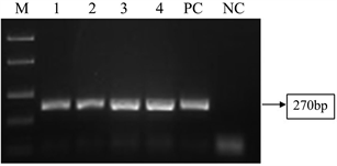 Figure 4. Multiplex PCR Analysis of Gram negative Type Strains and Uncultured Clinical Samples. Lane 1: ATCC 27626 Staphylococcus epidermidis, Lane 2: Streptococcus pnuemoniae-ATCC 6305, Lane 3: Enterococcus faecalis-ATCC 29212, Lane NC: Negative Control, lane PC: Positive Control ATCC 6538 MRSA, Lane M: Molecular marker (100 bp), Lane 5: Groin swab.