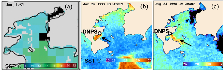 Figure 2. Satellite images showing SST in the Daya Bay before DNPS (a) and after DNPS (b), (c), and seasonal pattern of spatial distribution of thermal discharges. The circles indicate the location of the power station (DNPS); color bars with different ranges show sea surface temperature (SST). (a) January, 1985 [14] ; (b) January, 1999 [13] ; (c) August, 1998 [13] .