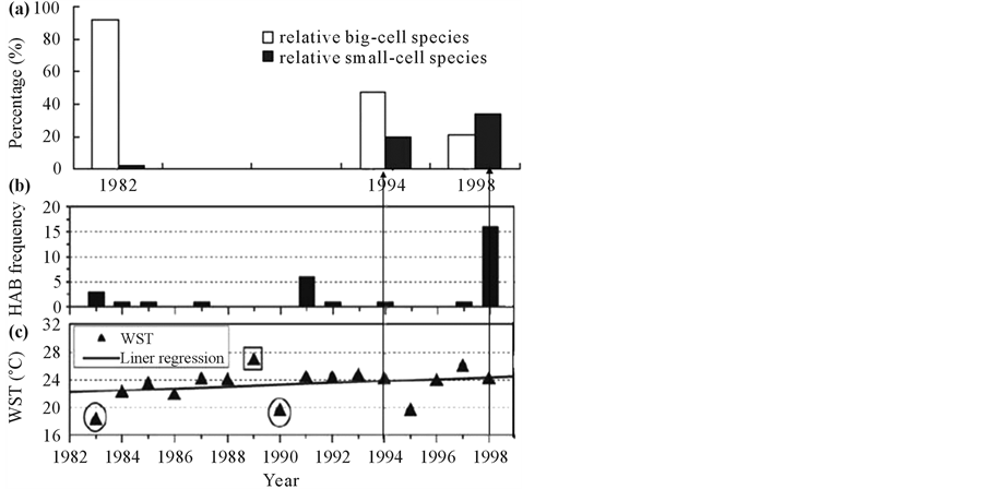 Figure 3. Phytoplankton community cell size and occurrences of HABs in the Daya Bay associated with water temperature from 1982 to 2004. (a) The decrease of the percentage of relative big-cell species of phytoplankton community and the increase of relative small-cell species during 1982- 1998 [16] ; (b) Occurring frequencies of HABs; (c) Water surface temperature [15] .