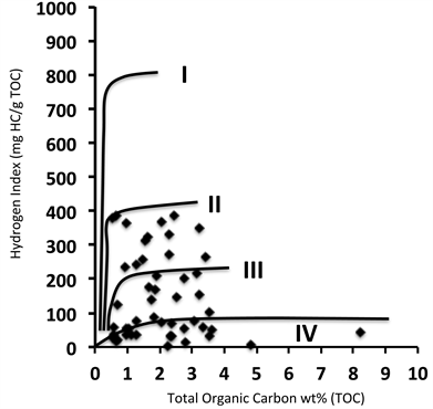 Kerogen is mainly classified into three types: Type I, Type II, Type III, [1] [45] and Type IV [53] . Kerogen types are defined on the basis of hydrogen/carbon (H/C) and oxygen/carbon (O/C) values, i.e., Hydrogen Index (HI) and Oxygen Index (OI) according to [54] [60] [61] . The use of Van Krevelen diagram was extended by [45] from coals to include kerogen dispersed in sedimentary rocks.