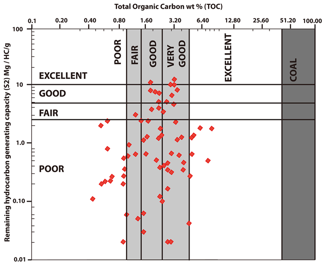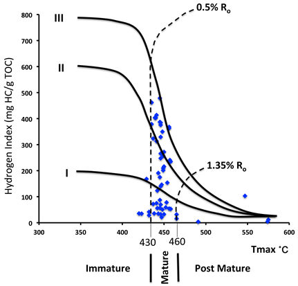 Source-rocks are precursors for hydrocarbon accumulation and reservoir potential. In general, source rocks are organic rich sediments that have, or may generate hydrocarbons [1] , and are a primary element in any petroleum system [2] . Successful exploration for oil and gas depends largely upon the quality of source-rock. To determine source rock quantity, total organic carbon (TOC) content, and quality, Rock-Eval technique is used. Rock-Eval pyrolysis methods have been utilized worldwide for more than three decades as an aid to determining source-rock parameters: Tmax, TOC richness, Hydrogen Index (HI), Oxygen Index (OI), Production Index (PI), the remaining hydrocarbon generating potential (S2), and a host of other products [3] - [11] . Rock-Eval pyrolysis is used to rapidly evaluate and depict the petroleum generating potentials of prospective source rocks [11] by providing information about their: 1) kerogen type and organic matter quality; 2) type of organic matter and characteristics; 3) thermal maturity of the organic matter; and 4) hydrocarbon type (oil, gas or both).