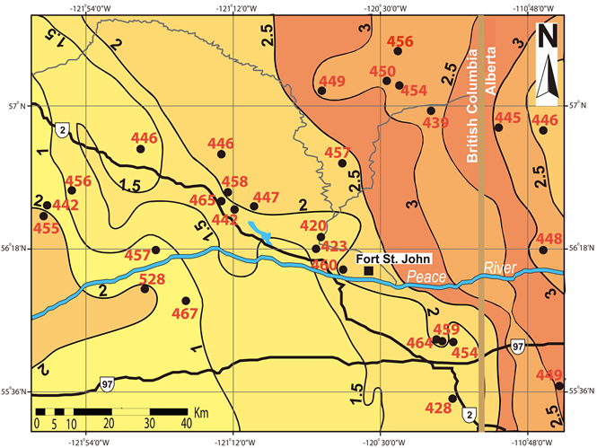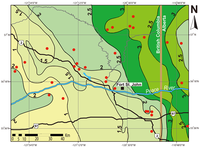 It is hypothesize herein that the TOC distribution in the study area (Figure 7) may be related to depositional environment’s proximity to organic matter source and preservation conditions. Where TOC values are greater than 2.4 wt% around Fort St. John (in a NW-SE transverse trending contour value 2) and