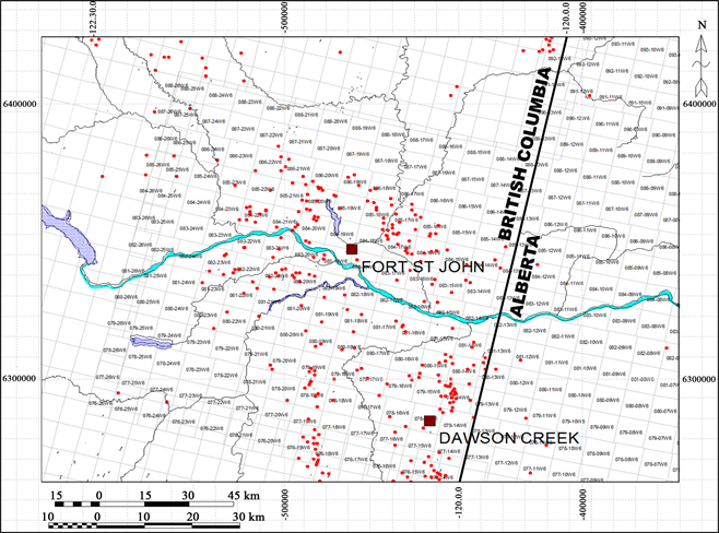 Figure 1. Location map of study area showing wells (red color) that penetrated Montney Formation in northeastern British Columbia and Alberta, Canada.