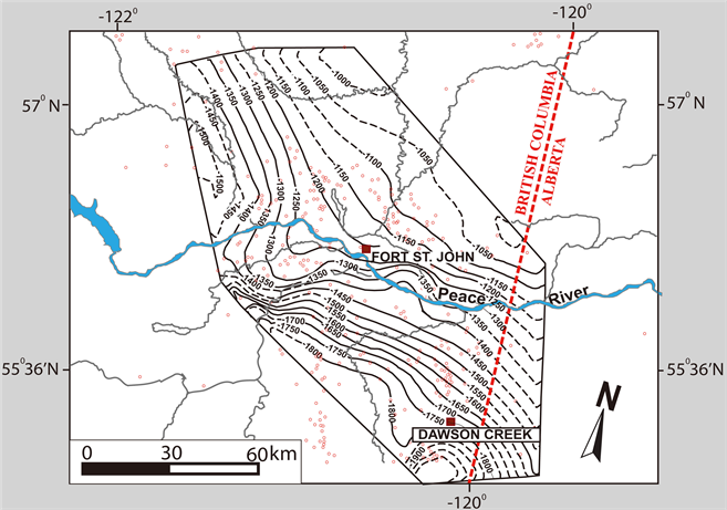 Figure 3. Structure contour map of the Montney Formation in the study area, northeastern British Columbia. Dash contour lines indicate no data point for well control. The structure map decreases in elevation westward, which indicates that sediment source area was from east, and prograded westward [2] .
