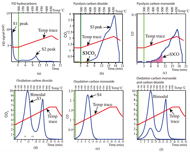 Figure 6. Rock-Eval pyrolysis for Montney Formation sample (well 2-19-79-14W6, depth: 2085 m). (a) illustrates the effect of pyrolysis temperature with Rock-Eval. The S1 peak is the free hydrocarbon liberated during thermal decomposition at less than 300˚C. The S2 peak is derived from the conversion of total organic matter to kerogen during pyrolysis (pyrolyzed fraction). The S2 corresponds to the maximum temperature (Tmax); (b) shows the S3 peak (CO2) corresponding to 400˚C, which represents the oxidation of CO2. It also shows the difference in organic matter; (c) illustrates the pyrolysis carbon monoxide (CO); (d) shows the oxygen indices. The determination of oxygen index (OI) is based on using CO2 and CO; the CO = S3CO × 100/TOC Total oxygen index (OI) = CO2 + OI (CO); (e) shows the S4 peak, the oxidation carbon monoxide (CO); the peak shows the present of siderite mineral (400˚C - 600˚C); (f) Oxidation of CO and CO2. The red line is the temperature trace in 25 minutes from 300˚C to 650˚C. Distinctly bi-modal curve is due to pyrobitumen.