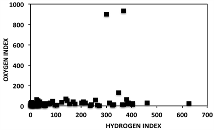The Oxygen Index (OI) measure in mgCO2/gTOC is calculated from the amount of CO2 released and trapped at temperature ranging from 300˚C to 390˚C (Figure 6) during pyrolysis [46] . The Oxygen Index corresponds to the quantity of carbon dioxide from S3 peak (Figure 6) relative to the TOC (mgCO2/gTOC); while Hydrogen Index (HI) corresponds to the quantity of pyrolyzable organic compounds or “hydrocarbons” (HC) from S2 peak relative to the total organic carbon (TOC) according to [11] . The hydrogen index (HI) was calculated from the ratio of S2/TOC using the method of [47] .