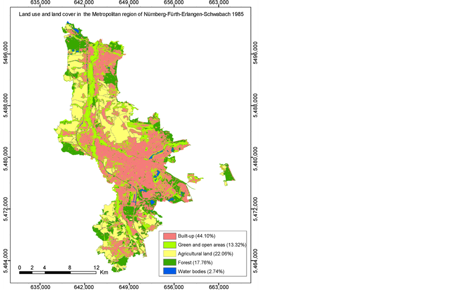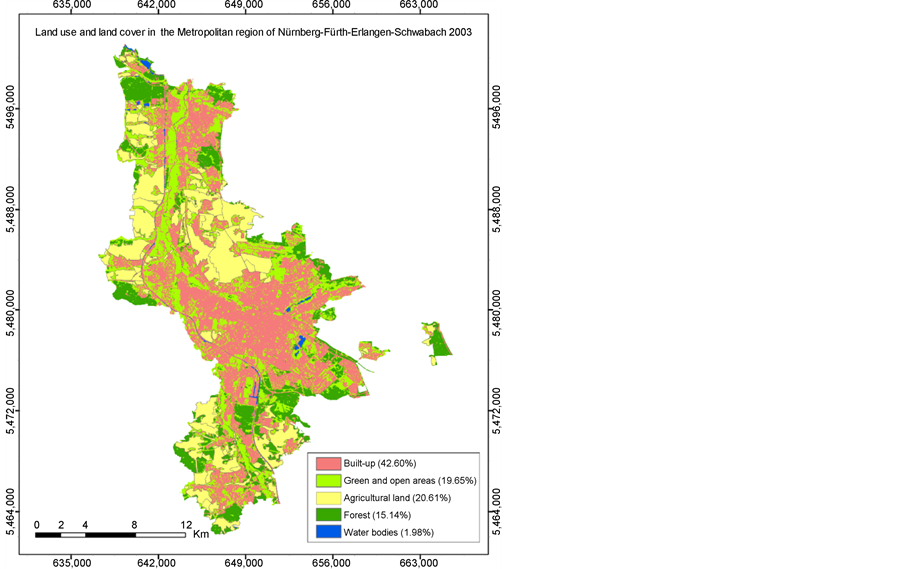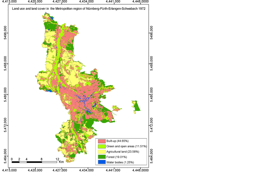 15.19% during the years of 2003 to 2015. Results (Figure 4, Figure 5 and Table 7) show that the forested area in the Northwestern and eastern part of Erlangen as well as the Southern part of Nürnberg has been converted into the green area and built-up area. The green and open areas covers about 11.51% of the total area of the region in 1972, 13.32% in 1985, 15.10% in 1998, 19.65% in 2003 and 12.01% in 2015.