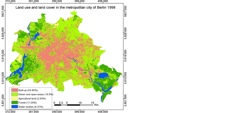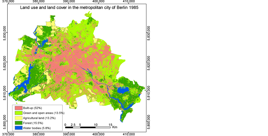 high proportion. The residential use is followed by commercial and industrial use. In contracts, a large part of the suburban area was covered with green, open area, forest and agriculture showing the various types of non-built-up proportions as well as their distribution. Interestingly, green and open areas have been increased through the years. The amount was 13.3% in 1972, 13.5% in 1985, 19.9% in 1998, 18.38% in 2003 and 14.3% in 2015 (Table 4). Figure 3 and Table 4 shows that the agricultural areas were gradually converted into the forest areas in the last 40 years. The forest area showed an increase over the time, 13.5% in 1972, 15.5% in 1985, 17.25% in 1998, 17.72% in 2003 and 16.28% in 2015. In small areas, the farmland was converted into forest areas, particularly in the district of Pankow on one hand. However, on the other hand large forest areas such as the Grunewald and Düppel in the southwest, the Spandauer and Tegeler forest in the north-west and the large forest areas in the Köpenick district in the southeast of Berlin are tracking attention. Figure 3 and Table 4 show that the agricultural areas in 1972 were still covered relatively large even up to the edge of the city. As Table 4 shows, there is a decrease in the amount of agriculture: 15.8% in 1972, 13.2% in 1985, 2.63% in 1998, 3.34% in 2003 and 2.46% in 2015. The increase in the area of settlements and traffic in the Berlin’s area is mainly at the expense of the agricultural land.