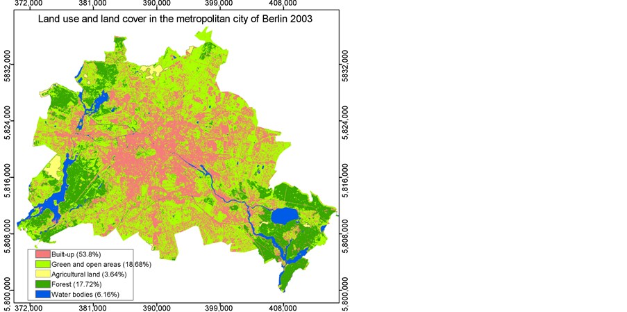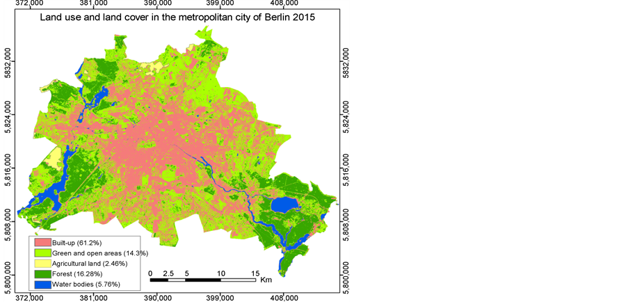 The estimation of classification accuracy is an integral part of the thematic evaluation of remote sensing data. Since the classification errors have influence on the accuracy of the change detection, the overall accuracy assessment must be considered. Additionally, the classification of the LULC and a reference map are compared with one another. In this regards, the basis of random raster samples [3] [20] , or by overlay and intersection. This explains the importance of the integration of remote sensing and GIS in the detection of LULC changes. The current study used Environmental Atlas of Berlin to evaluate the overall accuracy assessment. These reference maps are real use of the built-up, green and open areas of two years of 2002 and 2015 (No. 06.01, 06.02, Edition 2002, No. 06.01, 06.02, Edition 2015). These reference maps were used to compared the Landsat classification of 2003 and 2015 to estimate the classification errors (Table 5). To derive the LULC classes the Producer’s accuracies has been used. The Producer’s accuracy decreases when more pixels of a respective class has not been recognized. This is so an error of exclusion. The one-to-one check of classification accuracy shows that the overall accuracy of classification is 87.8% for 2003 and 94% for 2015. A standard overall accuracy for LULC classification is known between 85 [4] and 90 percent [21] . Table 5 shows the details of single class accuracy for the years of 2003 and 2015.