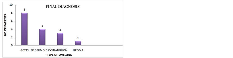 FNAC was performed in all the cases of which 8 cases where microscopically suggesting of Giant cell tumor, 4 cases of epidermal cysts, 3 cases of ganglion and 1 case suggesting lipoma.