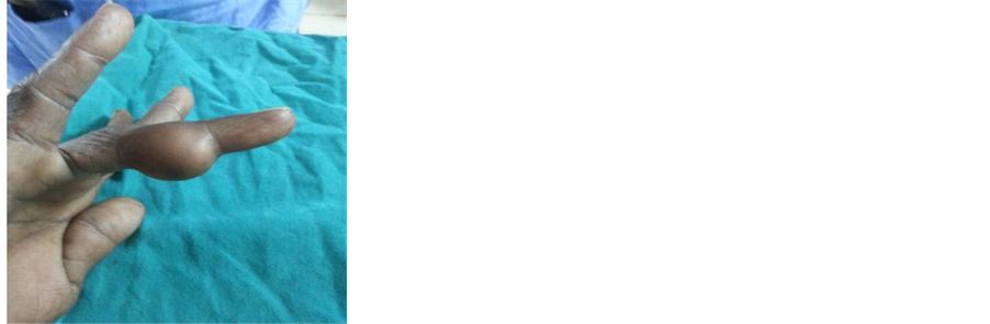 Between May 2012 and May 2014 a total of 16 middle aged patients between 30 to 50 years presented with swelling over volar aspect of fingers at Mamata General and Super Specialty Hospital. There were 10 female and 6 male patients included in this study. All the patients reported with long history which is of more than 1 year duration and there was no history of any trauma and there are no similar types of swellings anywhere in the body. All the patients had swellings over flexor aspect of fingers which are insidious in onset and gradually progressing. Of 16 cases; patients presented with swellings over right hand (dominant hand) were 12 and 4 cases on left hand. 12 out of 16 cases presented with pain of less than 6 months duration others had only presented with pain and restriction of movements due to swelling. There were no complaints of any paresthesia or numbness over fingers. There was no history of any constitutional symptoms in any of the patients.
