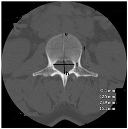 Figure 1. Axial section of the L3 lumbar vertebra passing through the pedicles (body and spinal canal dimensions). e: anteroposterior diameter of the vertebral body (DAPCV); f: transverse diameter of the vertebral body (DTCV); g: interpedicular distance of the spinal canal (DIP); h: anteroposterior diameter of the spinal canal (DAPCR).