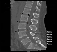 Figure 2. Mid sagittal section of the lumbar spine. i, k, m: heights of the anterior intersomatic space; j, l, n: heights of posterior intersomatic space; o, q, s: anterior heights of the vertebral bodies; p, r, t: posterior heights of the vertebral bodies.
