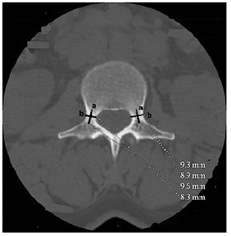 On an axial section passing through the pedicles at half height, the following parameters were measured: