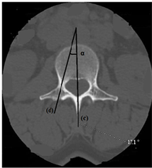 6) the alpha angle of inclination of the axis of the pedicle with respect to the median sagittal plane determined by a median passing through the vertebral body, the lumbar canal and the spinous process behind and a line parallel to the axis of the pedicle; it divides in its middle.