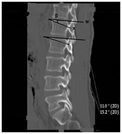 Figure 4. Sagittal section of the lumbar spine passing through the pedicles (beta angle). w: tangent to the upper plate of the vertebral body; x: axis of inclination of the vertebral pedicle on the horizontal; β: angle of inclination of the pedicle axis with respect to the horizontal plane.