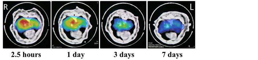 Figure 2. Typical example of the MPI images of the lung obtained at 2.5 hours, 1 day, 3 days, and 7 days after the intrapulmonary administration of magnetic nanoparticles (MNPs) (50 μL of 500 mM Resovist®) using a nebulized microsprayer connected with a high-pressure syringe under anesthesia, which were superimposed on the X-ray CT images. Note that the lowest and highest levels for display were set at the same in all the MPI images.