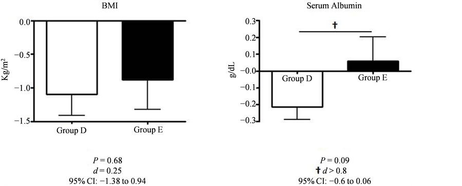 BMI was decreased in both groups after intervention (from 29.0 ± 2.6 to 27.9 ± 2.5 kg/m2 in Group D, from 30.1 ± 4.8 to 29.2 ± 4.9 kg/m2 in Group E); the change was not statistically significant (−1.1 ± 0.82 kg/m2 in Group D vs. −0.88 ± 0.98 kg/m2 in Group E, P = 1, d = 0.25). Serum albumin level in Group D was decreased (from 4.03 ± 0.70 to 3.81 ± 0.59 g/dL), and slightly increased in Group E (from 3.98 ± 0.43 to 4.04 ± 0.26 g/dL) after intervention. This difference between the two groups was not statistically significant (−0.21 ± 0.2 g/dL in Group D vs. +0.06 ± 0.32 g/dL in Group E, P = 0.1); however, it did present a large sized effect (d = 1.08). Values are presented as mean ± standard deviation. The large sized effect detected was d > 0.8.