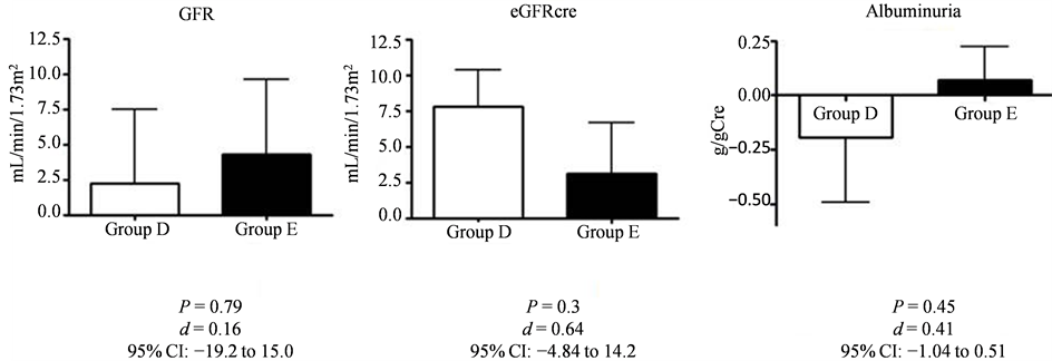 GFR was slightly increased in both groups (from 80.1 ± 38.5 to 82.4 ± 38.7 mL/min/1.73 m2 in Group D, and from 76.9 ± 26.1 to 81.2 ± 26.4 mL/min/1.73 m2 in Group E); the change was not statistically significant (2.21 ± 13.9 mL/min/1.73 m2 in Group D vs. 4.32 ± 11.8 mL/min/1.73 m2 in Group E, P = 0.79, d = 0.16). Estimated GFRcre values, after intervention, were slightly increased in both groups (from 59.3 ± 26.9 to 67.1 ± 32.7 mL/min/1.73 m2 in Group D, from 64.2 ± 24.5 to 67.4 ± 20.5 mL/min/1.73 m2 in Group E). The change was not statistically significant (7.78 ± 6.83 mL/min in Group D vs. 3.12 ± 7.92 mL/min in Group E, P = 0.3, d = 0.64). After intervention, albuminuria was decreased in Group D (from 1.01 ± 1.29 to 0.82 ± 0.78 g/gCre), and slightly increased in Group E (from 0.76 ± 0.96 to 0.83 ± 1.19 g/gCre). However, the difference between the two groups was not statistically significant (−0.191 ± 0.79 g/gCre in Group D vs. 0.072 ± 0.34 g/gCre in Group E, P = 0.63, d = 0.41). Values are presented as mean ± standard deviation.