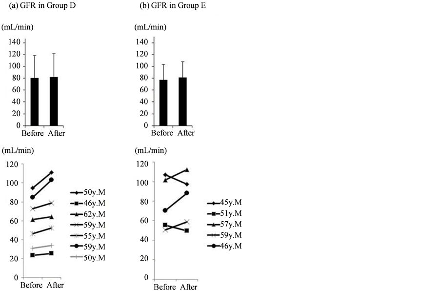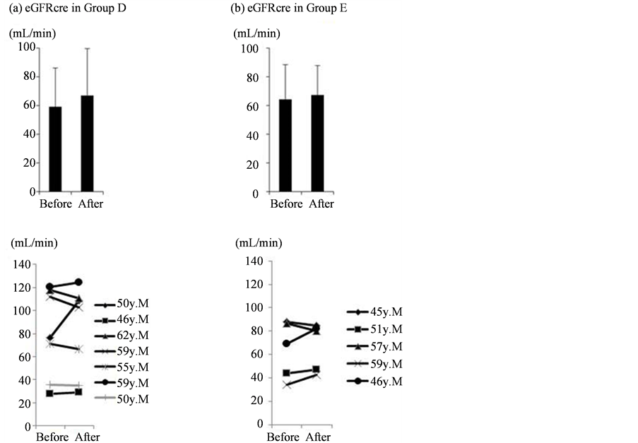 Estimated GFRcre was increased in Groups D and E (a, b). The upper section shows overall the mean values, while the lower section shows individual changes after intervention.