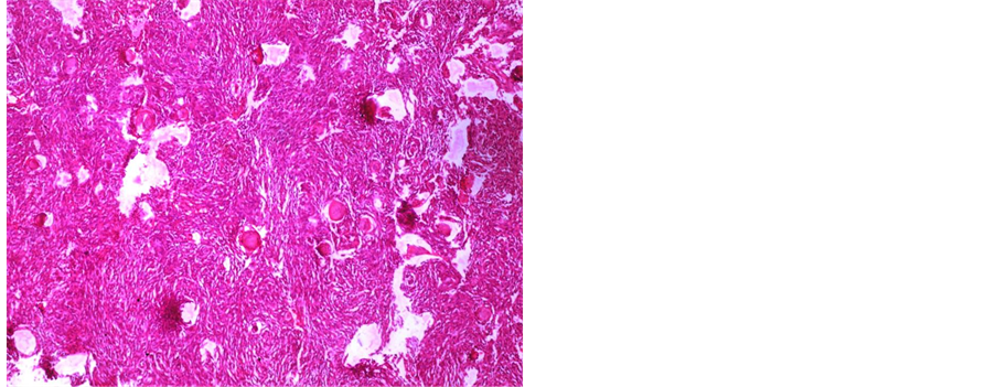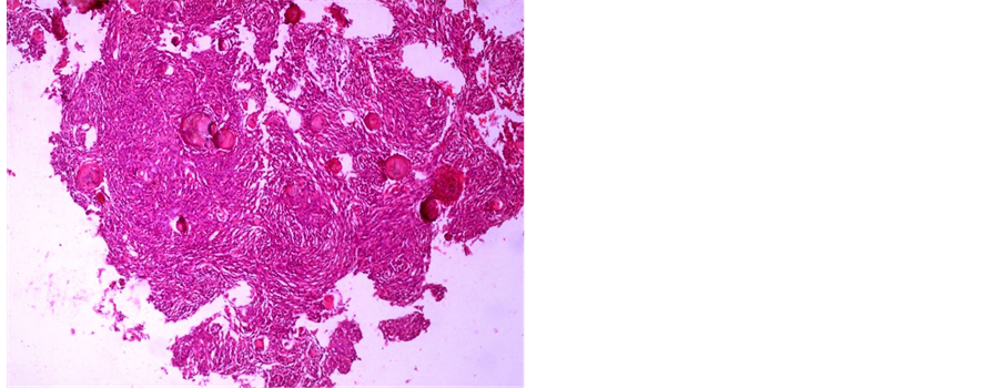 A 61-year-old female patient was with history of spinal trauma in 26 year ago. Patient fall down from height and had a traumatic L1 fracture. Patient was managed conservatively at that time as she refused surgical intervention and had no neurological deficit. Patient experienced frequent attacks of low back pain and rarely sciatic pain that was treated with analgesia. 6 months ago, the patient had a progressive heaviness in both lower limbs with urinary incontinence and visited the outpatient clinic. On examination, the patient was paraparetic with motor power grade II or III below L1. Patient had hypotheisa below L1 with diminished knee and ankle reflexes. MRI lumbar and dorsal spine showed the post-traumatic L1 fracture with a new large intra-dural mass most probably meningioma or schwnoma as shown in Figure 1. Patient operated with posterior lumbar approach including posterior L1 and D12 laminectomy. Total standard microscopic excision of the intra-dural soft tissue mass with moderate vascularity was performed successfully. A posterior D11, D12 and L2 trans-pedicular screw fusion was performed at the end of the procedure. Histopathological examination revealed multiple nodules of proliferated meningothelial cells separated by delicate fibrous tissue, with thick walled blood vessels and calcified psammoma bodies together with oval to rounded cells with oval nuclei, occasional nuclear clearing and infrequent mitosis arranges in whorly pattern with rounded calcified psamma bodies. A meningeothelial and psamomatous meningioma was reported as shown in Figure 2. The patient has smooth postoperative course with improvement of her neurological deficit with physiotherapy. 4 months after surgery, the patient was able to ambulate without assistance. On her last follow up after one year of surgery; the patient has no neurological deficit and can ambulate without assistance