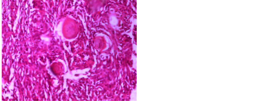 Figure 2. (a) Photomicrograph showing multiple nodules of proliferated meningothelial cells separated by delicate fi- brous tissue, with thick walled blood vessels and calcified psammoma bodies, H & E × 40 (b) and (c) Photomicr- graph of meningioma showing oval to rounded cells with oval nuclei, occasional nuclear clearing and infrequent mi- tosis arranges in whorly pattern with rounded calcified psammoma bodies, H & E × 400.