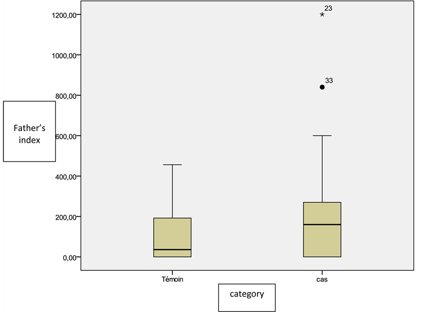 The exposure average index for all risk products was of 191.1 ± 113.8 for the fathers of cases versus 110.1 ± 102 for the fathers of controls with a statistically significant difference (p = 0.01); OR = 1.003, IC 95% = [1.001 - 1.005] (Figure 2).