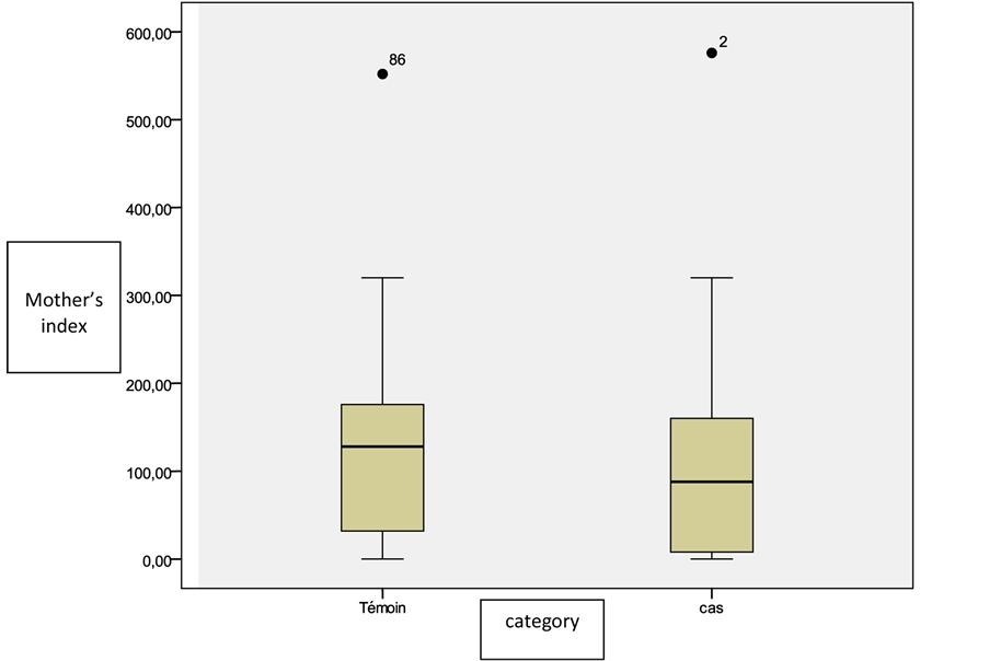 The exposure average index for all risk products was 119 ± 110 for mothers of cases versus 132 ± 102 for mothers of controls without a statistically significant difference (p = 0.7) (Figure 1).