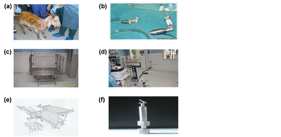 Experimental surgical instruments were prepared by the goats’ weight and height for the deep intro-thoracic operations. The equipment included anesthesia machine (NARKOMED2C12662), multi-parameter anesthetic gas monitors (Vamos), Electrocardiogram (Agilent CM2001, RSM-4101K, MIHON KOHDEN, Japan), and ACT measuring instrument (ACT II, Medtronic Inc, America). There were also several innovative design of equipment such as removable modular transporter animal care bed [17] (National Invention Patent No.ZL 201210042605.8, Figure 1(c)), portable medical devices [14] (National utility model patent No.ZL 2011203- 25472.6 Figure 1(d)), multiple-functional animal surgery bed [18] (National utility model patent No. ZL 201110374405.8, Figure 1(e)) and spiral-myocardial punchers (Figure 1(f)) [19] .