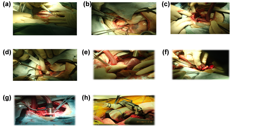 We give the implementation of catheterization or bladder puncture, gastrostomy to decompression detection of invasive arterial blood pressure, electrocardiogram, oxygen saturation, and serum biochemical indices. In order to make the activated clotting time (ACT) to 400s we give the intravenous heparin 1.5 mg/kg. We also give the Pioneer-5 1.5 mg and dexamethasone 10 mg preoperatively. After preparation we implemented the left ventricular assist device (LVAD) [20] [21] at the apical and the exit of blood pump was connected with descending aorta by artificial blood vessels. The wire of blood pump was exported from chest incision and placed chest drainage device. By this way we established the left ventricular-LVAD-descending aorta circulation loop (Figure 2(a)): Thoracotomy at the left fourth intercostal space; (Figure 2(b)): The side wall of the descending aorta clamp clip; (Figure 2(c), Figure 2(d)): Descending aorta connected with artificial blood vessels; (Figure 2(e), Figure 2(f): Apical drilling; (Figure 2(g), Figure 2(h)): Implement LVAD at apical and detect the device data.