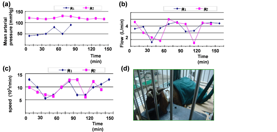 After general anesthesia we give the goats’ conventional skin disinfection and paste electric knife negative plate which was fixed by elastic bandage. In the process of operation we pay close attention to the rate, press, oxygen saturation, breath and salivation. We also reported the parameters for the doctors to regulate the blood pump [23] . When the speed reached to 8000 - 10000 r/min and the flow reached to 4 - 5 L/min the blood pump could maintain the goats’ normal pressure (Figures 3(a)-(c)).