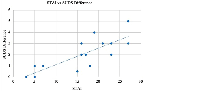 A comparison of the STAI values and the SUDS difference was made to assure that both were consistently measuring induced anxiety. The comparison produced a notable positive correlation (Figure 1).