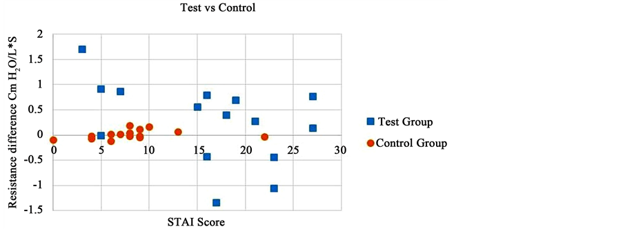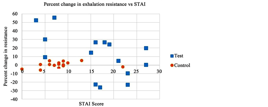 Figure 5. Relative changes in respiratory resistance in the exhalation direction as affected by STAI score for the Test and Control groups.