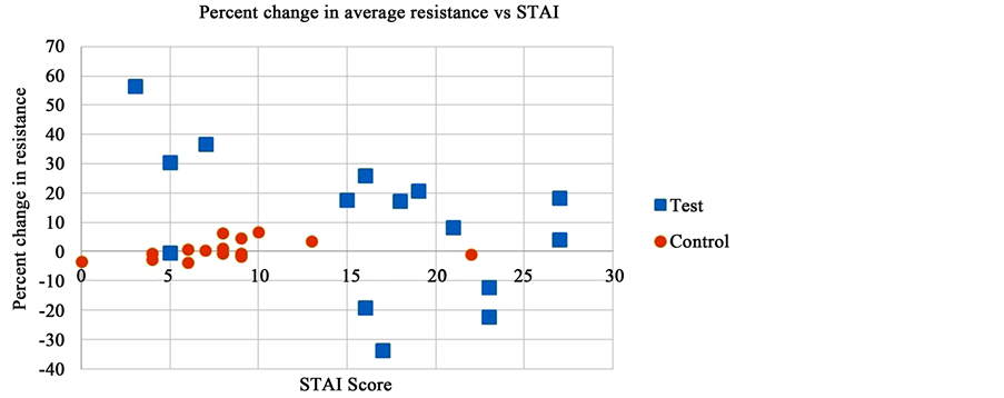 Figure 3. Relative changes in average respiratory resistance as affected by STAI score for the Test and Control groups. Test group data are noticeably more spread than are Control group data.