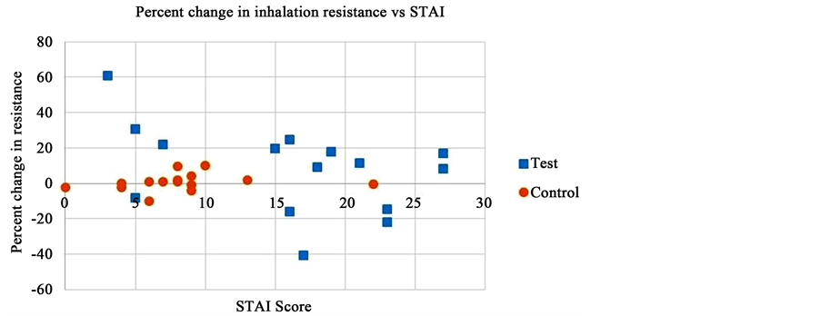 Figure 4. Relative changes in respiratory resistance in the inhalation direction as affected by STAI score for the test and control groups.