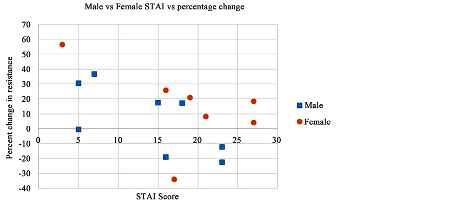 Another area examined is the male versus female reactions in the Test group. The resulting T tests revealed that we could not reject the null hypothesis for the pre- to post-treatment STAI anxiety measures, or for the differences in respiratory resistance (Table 3). There was, however, a statistically significant difference in the SUDS score comparing the pretreatment condition to the posttreatment condition. Figure 6 shows the percentage changes of average respiratory resistance for both genders in the Test group as related to differences in STAI score before and after treatment.