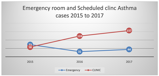 Figure 1. Emergency room and scheduled clinic asthma cases 2015 to 2017.