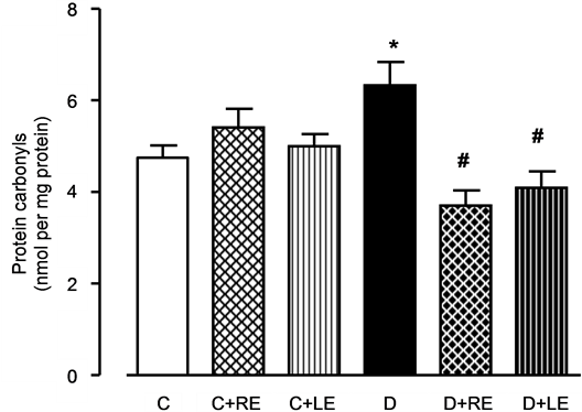 Figure 3. Effects of hydroalcoholic extracts of yacon leaves and roots on protein carbonylation in the liver. Protein carbonylation was measured in freeze-clamped livers as described in the Experimental Section. The legends under each column represent: C, control; C + RE, control treated with the root extract; C + LE, control treated with leaf extract; D, diabetic; D + RE, diabetic treated with root extract; D + LE, diabetic treated with leaf extract. Values represent mean ± standard error of 4 to 7 animals for each experimental condition. *p < 0.05 compared to the control group, #p < 0.05 compared to the diabetic group.