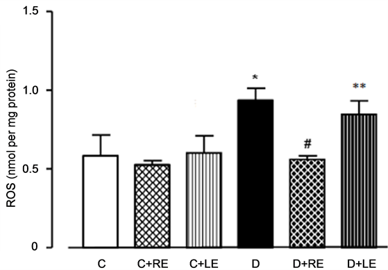 Figure 4. Effects of hydroalcoholic extracts of yacon leaves and roots on the ROS content in the liver. The ROS contents were measured as described in the Experimental Section. The legens under each column represent: C, control; C + RE, control treated with root extract; C + LE, control treated with leaf extract; D, diabetic; D + RE, diabetic treated with root extract; D + LE, diabetic treated with leaf extract. Values represent mean ± standard error of the mean from 5 to 8 animals for each experimental condition. *p < 0.05 compared to the control group, #p < 0.05 compared to the diabetic group, **p < 0.05 compared to the D + RE group.
