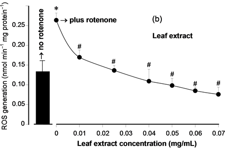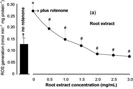 Figure 1. Concentration dependence of the inhibition of ROS generation in isolated rat liver mitochndria by the yacon extracts. (a) Mitochondrial ROS generation in the presence of leaf yacon extract; (b) Mitochondrial ROS generation in the presence of root yacon extract. The ROS generation was measured in isolated mitochondria, as described in the experimental section. The bar in the left of each panel indicates the ROS production in the absence of rotenone. All measurements in the presence of both extracts were done in the presence of 10 µM rotenone. Each datum point represents the mean ± standard error of the mean of 3 - 4 animals. *p < 0.05 for the enhanced ROS production in the presence of rotenone; #p < 0.05 for the inhibition of ROS generation in the presence of both extracts.