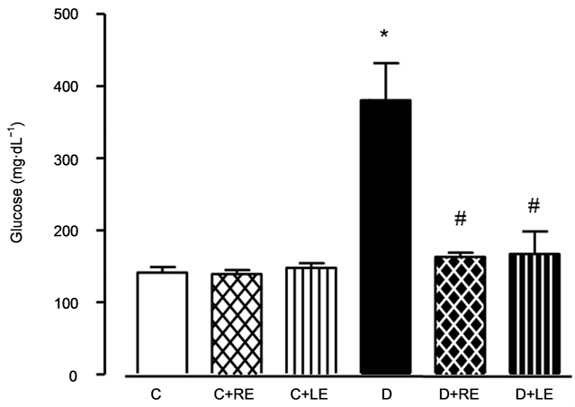 Figure 2. Effects of the hydroalcoholic extracts of yacon leaves and root on blood glucose levels in fasted non-diabetic and diabetic rats. The hydroalcoholic extracts of yacon roots and leaves were prepared and administered as described in the Experimental Section. The legends under each column represent: C, control rats; C + RE, controls treated with root extract; C + LE, controls treated with leaf extract; D, diabetic rats; D + RE, diabetic rats treated with root extract; D + LE, diabetic rats treated with leaf extract. Data are the mean ± standard error of the mean of 5 - 7 animals for each experimental condition. *p < 0.05 compared to the control group, #p < 0.05 compared to the diabetic group.