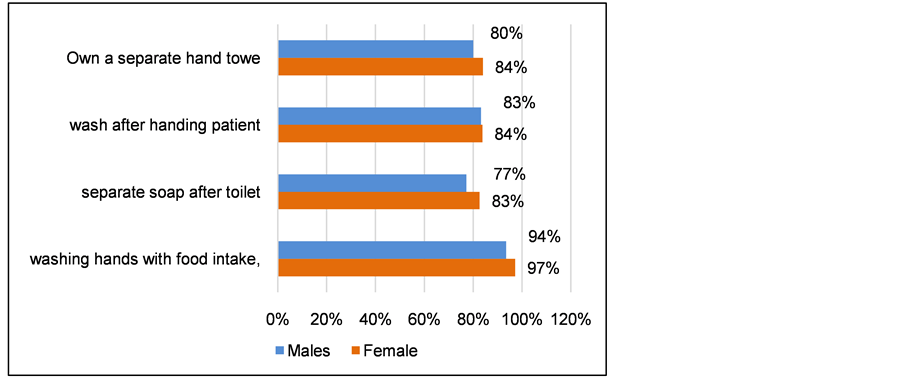 This part (Table 3) deals with practical aspects of daily life. The majority of respondents (95%) wash their hands before and after food intake, 85% uses soap and water, but a considerable number (8%) use only water and very few uses alcohol base cleansing agent. 84% wash their hands after handling patients. Above 80% keep their own soap and towels after using the toilet. Figure 1 shows male and female responses on hand hygiene practice, there is marginal difference in washing hands before and after food intake and other practices, both cases have an odd of 0.4 and an odd ratio of 1 showing no significant differences in both sexes.