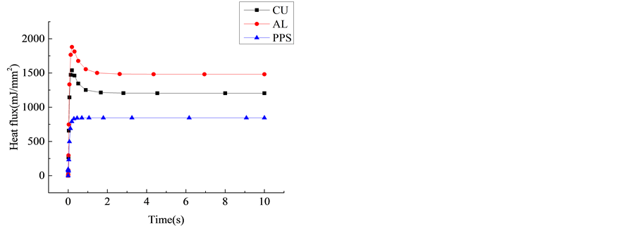 To compare the specific difference between the heat transferring rate, Figure 8 shows the heat flux of the pin fin variation over time. The heat flux of CU and AL increased to a maximum in a short time and decreased until the balance slowly, while the curve of PPS hasn’t decreased process. It could be found that qCU > qAL > qPPS.