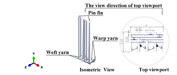 The structure of fabric heat sink is shown in Figure 2(a). For comparison, the configuration of a common pin fin heat sink is illustrated in Figure 2(b). The geometrical model consists of the continuous loop yarn as heat transferring pin fins (hereafter, referred to fabric pin fins) and the pin fins carrier fabric. Fabric pin fins are fixed to the carrier fabric, and it is just like the pin fin fixed on the base plate in Figure 2(b). The carrier fabric can be fabricated by the plain, twill and satin texture. There, the twill (3/1) texture is simulated, and the weaving parameters are shown in Table 1.